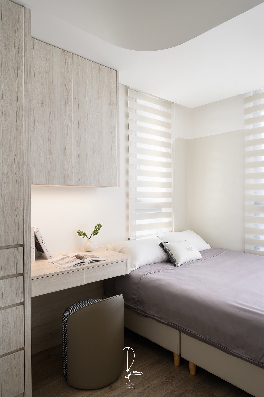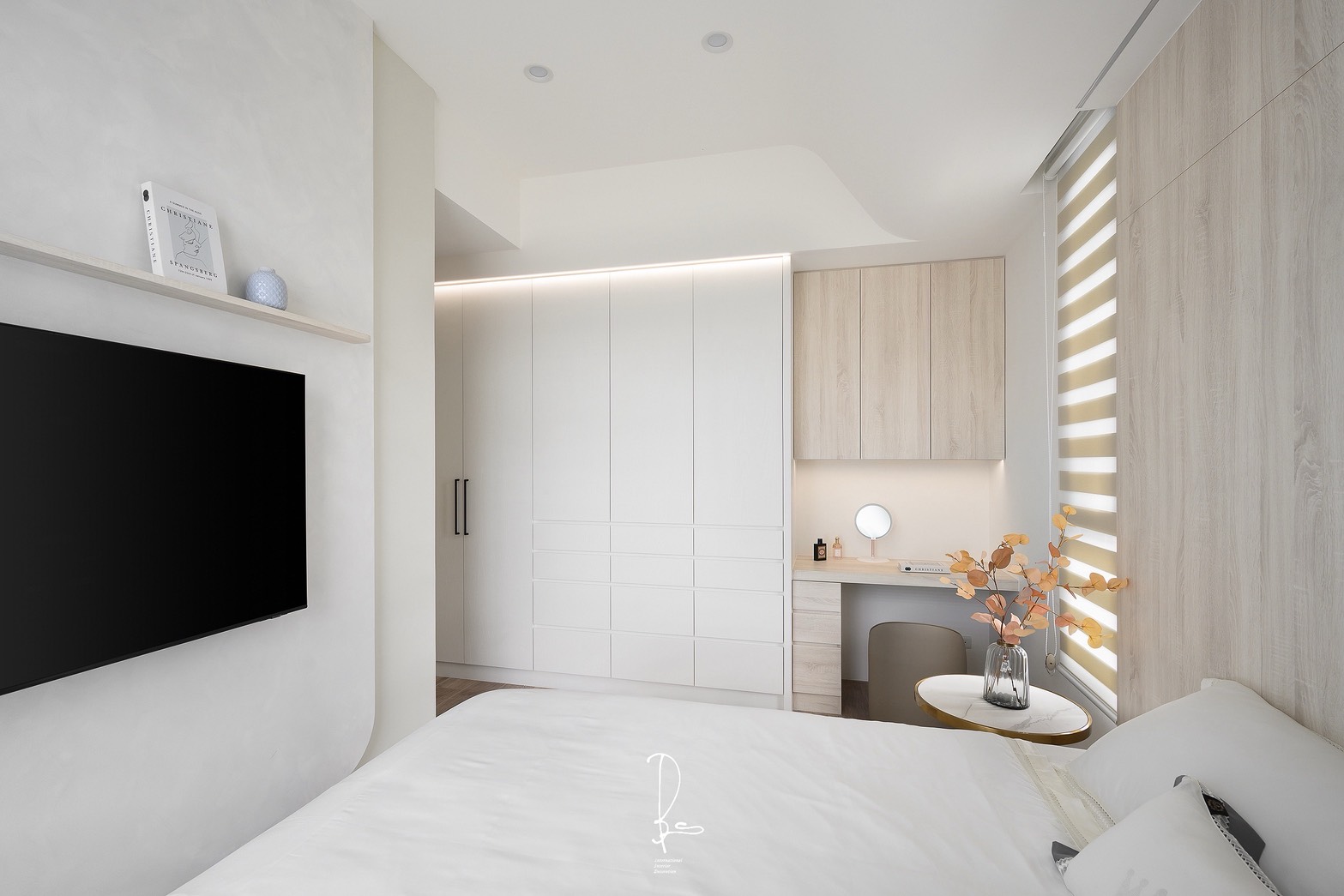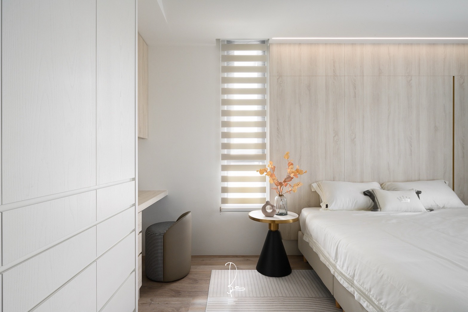 在微光甦醒的時刻,晨霧般的純白輕輕擁抱空間,為每一道光影留下呼吸的縫隙。溫潤的奶油色系,像是初晨的溫度,在侘寂的線條中,低語著關於日常的平靜。一抹木質的溫度,為冰冷的留白注入柔軟,遠方的林木,為歸來的人守住一盞溫暖的燈火。此處不需要繁複的點綴,因為「少」就是最純粹的豐盛,當日子慢慢行走於此,心,也能慢慢與自己對話。「晨霧」,是一種輕盈。